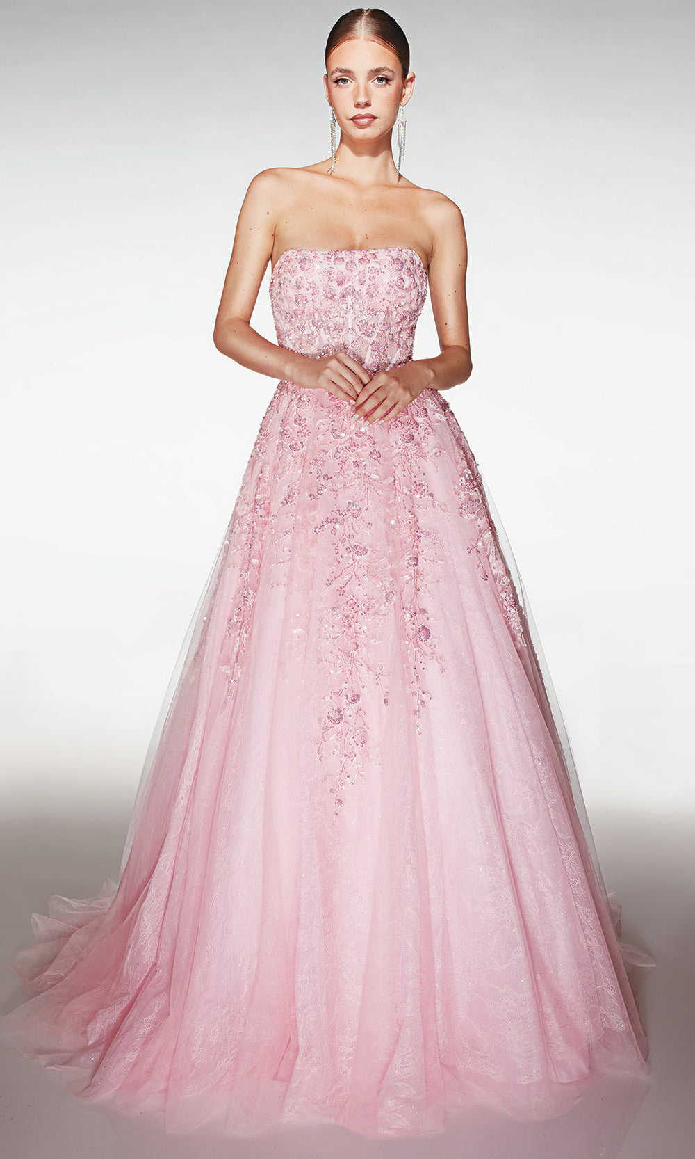 cette robe de bal apporte une présence digne d’un conte de fées à tout événement grâce à son design majestueux et son charme intemporel. L’encolure sans bretelles s’harmonise parfaitement avec un corsage corseté structuré, créant une silhouette flatteuse rehaussée par de délicates appliques florales qui attirent le regard sur chaque détail raffiné. La coupe robe de bal volumineuse présente des couches de tulle superposées qui ajoutent de la dimension et du mouvement, tandis que le dos à lacets assure un ajustement personnalisable.